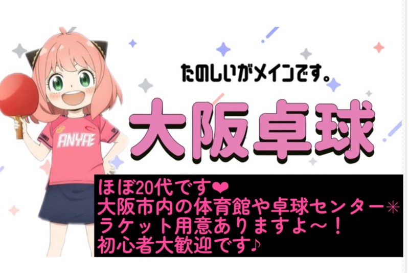 卓球大阪大阪の卓球チームです。現在、メンバーを募集しています。募集しているのは20代が殆どです⭐️未経験、経験問わず⭐️マナー等大丈夫な方であればどなたでも✨。卓球に興味がある方は、ぜひご応募ください。| 募集の状態 | 募集中 |