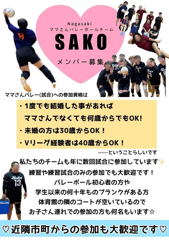 バレーボール長崎長崎のバレーボールチームです。現在、メンバーを募集しています。募集しているのはママさんバレーなので女性の方でお願いします。バレーボールに興味がある方は、ぜひご応募ください。| 募集の状態 | 募集中 |