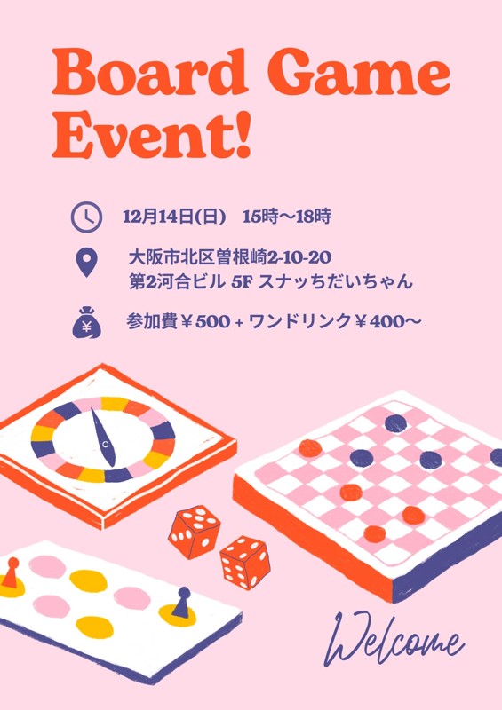 | 連絡事項や アピールポイント | 梅田のBARを貸し切りにてボードゲーム会をします🎮🌟 人数が増えてきたらレンタルスペースなどを借りて場所を変更しようと思っています。 年齢制限はありません🙇♂️ 主に20.30代中心になると思います! 15名程で開催予定です。 ボードゲーム参加費: 500円+ワンドリンク〜 ワンドリンクは400円〜あります。 ボードゲーム以外に交流会などのイベントも時々してます 場所:大阪府大阪市北区曾根崎2丁目10−20 河合ビル2 5階 スナッち だいちゃん 第1回✨6月14日(土)14時〜17時 第2回✨7月12日(土)14時〜17時 第3回✨8月23日(土)14時〜17時 第4回✨9月13日(土)14時〜17時 タコパイベント🐙 9月22日(月)19時半〜22時半 BBQイベント🍖 10月11日(土)11時半〜15時半 場所:淀川河川公園 西中島地区 第5回✨10月25日(土)14時〜17時 第6回✨11月15日(土)15時〜18時 15時開始に時間変更しました🙇♂️ 鍋パイベント🍲 11月29日(土)18時〜21時 ボードゲームと場所は同じです 参加費2000円+ワンドリンク400円〜 第7回✨12月14日(日)15時〜18時 途中参加・途中退室自由です! ボードゲーム持ち込んで頂くの大歓迎です◎ 質問等あればお気軽にどうぞ☺️ ビジネス・勧誘目的の方はお断りしています。 まだ立ち上げたばかりで新規メンバー絶賛募集していますので、よろしくお願いします🙇♂️✨ 今からなので1人参加の方とかも交流しやすいと思います! |