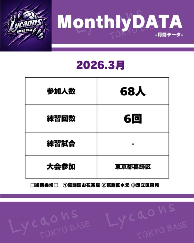 | 連絡事項や アピールポイント | 🚩チーム名【リカオンズトーキョーベース】 ・東京都葛飾区バレーボール連盟加盟 ・男子6人制バレーボールチーム ▶️気になる方はお気に入りに登録お願い致します🙇♂️ =================== <大会および練習試合実績> 2025年8~12月: 主催大会×1、大会参加×2(公式戦×1)、練習試合×4 戦績:4勝10敗1分 2026年1月:公式戦×1、 2月:主催大会×1、練習試合×1 3月:公式戦×1、主催大会×1 戦績:3勝4敗2分(※2026年3月現在) =================== ■練習場所 ①足立区東和地域学習センター JR常磐線亀有駅より約徒歩15分 ②JR常磐線亀有駅、京成本線お花茶屋駅より約徒歩15分 駐輪場あり,駐車場数台(先着) ============== 【2026年4月練習日程一覧】 ①6日,13日,27日(月) 18:30-21:00 足立区東和地域学習センター ②3日,10日,17日,24日(金) 18:00-21:00 葛飾区内 =================== 【活動地域】 ・おもに東京都葛飾区、足立区 【チームスローガン&コンセプト】 ・難攻不落/勝ちにいく戦いの実践 【練習内容】 ・基礎~実戦想定練習 ====================== 【募集要項】 ・年齢:18歳〜45歳程度まで ・ポジション:全ポジション ・競技歴:3年以上 ・ネットの高さ:243cm 【参加費】 ・单発参加 一回500円 ・所属メンバー月額制あり(都度単発参加も可能) 月3,000円 ※所属メンバーはユニフォームシャツ購入可能(7,000円程度) ■チーム加入までの流れ■ ・単発3回参加後チームに加入するかどうか検討いただけます。 ※チーム加入後各試合にエントリー可能となります。 ✅参加条件 ※必須:バレー戦術理解 ・真摯に練習に取り組めること ・練習して上手くなりたい熱意あるプレーヤーもお待ちしています。 ========================= 【参加希望の方は下記コピーの上ご回答お願い致します】 ①お名前: ②ご年齢: ③掲載の練習日程で、1度参加してみたい日時: ※ご希望日時の前日程度前までにご連絡ください。 ④バレーボール競技歴、ポジション: ※経験年数、大会出場歴など ⑤ブランクの有無: ⑥その他確認したい事など: ⑦健康状態について:問題なしor相談あり をご連絡ください。 ご不明点などお気軽にご連絡ください! 【その他事項】 ※使用球:ミカサ、 molten5号球 (ソフトバレーではありません) ※練習や試合の様子はSNSにUPしていきます。 ※宗教、ビジネス勧誘行為、ハラスメント等禁止。 ※他プレーヤー、チームを不快にさせる貶める言動、行動をした場合には即時除名処分。 ※途中参加、途中帰宅OKです。 【現在のメンバーについて】 ・競技経験→中学部活、高校部活、大学体育会、クラブチーム経験者など ・葛飾区、足立区はもちろん近隣の東京都23区、千葉県、埼玉県、神奈川県から来ています。 ・ボリュームゾーン 20~28歳 |