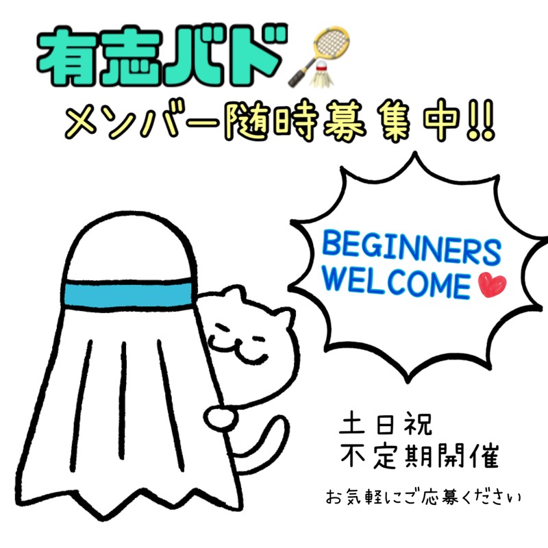 | 連絡事項や アピールポイント | 臨時で場所を確保し、有志を集いバドミントンをしています。 あまり定期的に参加できない方、お気軽にご応募ください。 お連れ様がいる場合は人数分の記載をお願いします。 ▼応募の際の必要事項 名前: 性別: 年齢: バド経験: 希望の参加日程: ▼活動場所 ・荒川区 生涯学習センター(2面) ・荒川区 荒川さつき会館(1面) ・荒川区 南千住ふれあい館(1面) ・荒川区 汐入ふれあい館(1面) ・荒川区 町屋ふれあい館(1面) ・荒川区 荒川山吹ふれあい館(1面) ▼募集レベル 完全未経験OKです! が、経験者率は高いのでご容赦ください。 (でも皆やさしいです!) ※経験3年〜10年くらいまでが多いです。 ▼男女比・年齢層 男性:女性=7:3くらい 年齢層は、20代後半〜40代くらいが中心です。 成人済みの方のみでお願いします。 ▼参加費 700円 ※PayPayまたは現金払い ▼その他注意事項 ・勧誘や営業、出会い目的のナンパ行為等の迷惑行為は全て禁止です。 ・遅刻早退可ですが減額はできません。大幅な遅刻や直前キャンセルは必ず一言ご連絡ください。 ▼直近の活動予定日 【満員】2/11(水祝) 12:00-15:00 場所:荒川区 生涯学習センター アクセス:JR三河島駅 徒歩3分 2回目以降の参加はLINEのオープンチャットに加入いただきますが、オープンチャットは個人アカウントの特定ができないのでご安心ください(*^^*) よろしくお願いします! |