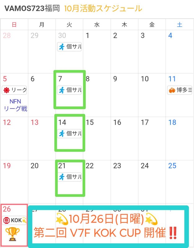 | 連絡事項や アピールポイント | 💫蹴球の楽しさをを分かち合える仲間が、ここに居る! ご覧頂き、ありがとうございます🙂↕️『VAMOS723福岡』です。 現在、VAMOS723福岡では、新メンバーを募集しています‼️ 『試合で勝ちたい!もっと上手くなりたい!』そんな向上心を持った方や、 運動不足を解消したい方、サッカー/フットサルが好きな方、初心者だけど始めてみたい方など、経験者/未経験者ともに大歓迎です😆 「興味はあるけど、ついていけるか不安…」と、言う方もご安心ください。 私たちは、みんなで楽しくフットサルをする事を一番に考え活動してますので、初心者の方でも経験豊富なメンバーが、しっかりサポートします🍀 【チーム活動詳細】 個サル開催//リーグ戦参戦//1Dayカップ開催//練習試合実施//メンバー交流イベント実施 🌟毎週/ほぼ火曜、時々別曜日に 『Enjoy個サル練習』を開催しています⚽🏃🏻♀️ (個サル=個人参加型のフットサル練習) 🔅個サル詳細 開催曜日∶毎週/ほぼ火曜、時々別曜日 場所∶糟屋ドーム (空調付き室内コート) 時間∶20時〜22時 駐車場∶無料 参加費∶500円 最寄駅∶JR長者原駅 💫空調付き室内コートなので、女性も男性も『肌の日焼け』を気にする事なく、オールシーズン快適な環境でプレーできます 🌐こんな方におすすめ! * もっと上手くなり、試合で活躍したい * 運動不足を解消したい * 新しい友達を作りたい *サッカー/ フットサルがとにかく好き🍀 * 久しぶりにボールを蹴りたい あなたの思いを叶えるために、VAMOS723福岡の個サル練習に参加してみませんか? ご興味のある方は、お気軽にご連絡ください📩 一緒にフットサルで、良い汗を流しましょう😆 【未経験の方も、久しぶりにボールを蹴る方も、ご安心下さい🍀】 『個サルあるある』ですが、きちんとしたウォーミングアップ無しに、ゲーム(紅白戦)に参加して怪我をしてしまうケースが、世代を問わず起こっています…😓 そうした怪我のリスクを軽減する為、VAMOSの個サルでは、ゲーム開始前に15分〜20分程度、全体ウォーミングアップと基礎練習を実施します。 また、ゲーム終了後には、5分程度のクールダウンストレッチを実施しています。 なので、初心者の方や久しぶりにボールを蹴る方でも、安心してご参加頂けます😃 【個サル参加条件】 男性は、経験者/初心者、共に歓迎します 女性は、少しでもプレー経験があればOKです🍀 ◆プレー強度は、エンジョイレベルなので、気軽に楽しくプレーできる個サルになっています😄 【個サル練習 詳細】 ※参加費:500円 ※駐車場:無料 ※対象年齢:20代~50代の方 ※フィールド:空調付き屋内フィールド ーーーーー 【名称】バモス723福岡 【創立】2024年5月1日 【種目】フットサル/サッカー/ソサイチ ☆2025年より、フットサルFNFリーグに参戦! 【練習】毎週/ほぼ火曜、時々別曜日の20時〜 ☆糟屋ドームで個人参加型練習(個サル)を開催⚽ 🌟【参加費:500円】🌟 男性は、経験者/初心者、共に歓迎します 女性は、少しでもプレー経験があればOKです 参加希望の方は、気軽にご連絡下さい📩 ーーーーー ☆バモス723福岡☆ 【 正規入部メンバー募集中!】 経験者/未経験者、共に歓迎します ◆正規入部の申込みは、気軽にご連絡ください🙂↕️ ーーーーー 【 練習試合の申込み受付中 】 練習試合の申込みは、気軽にご連絡ください🙂↕️ |