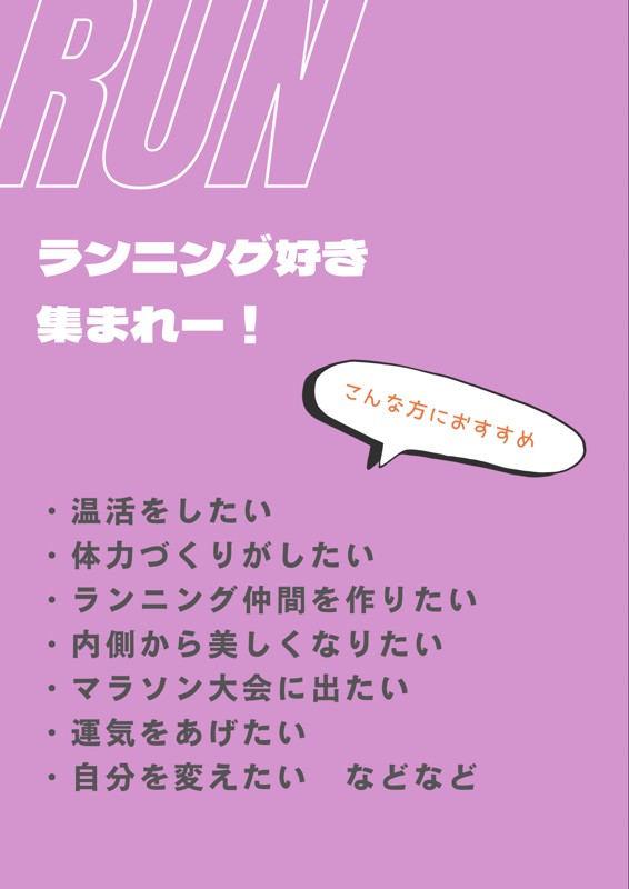 | 連絡事項や アピールポイント | まだまだ小さな集まりですが、毎回楽しく走っています。自分のペースで無理せず走るをモットーに月に2回開催。11月は16日、30日の日曜日に練習会を予定しています。参加希望の方はお気軽にメッセージください♪ |