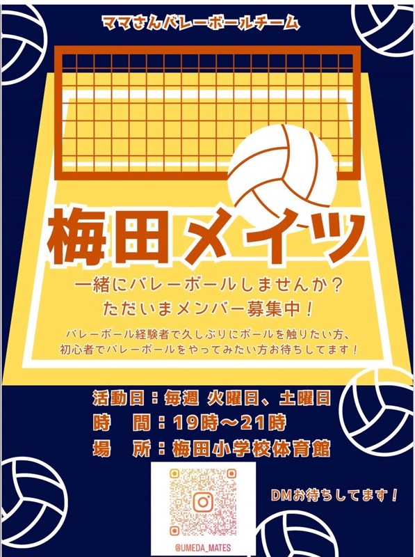 | 連絡事項や アピールポイント | 茅ヶ崎市の梅田小学校で活動している ママさんバレーボールチームです。 お子さんが小さくても、連れて来ていただき様子を見ながらゆっくりと練習に参加してもらえます。 在籍のチームメンバーも子育て経験者なので、ご安心ください。 運動不足解消やもう一度バレーボールを始めたい方も一度ご相談ください。 体験もできます! |