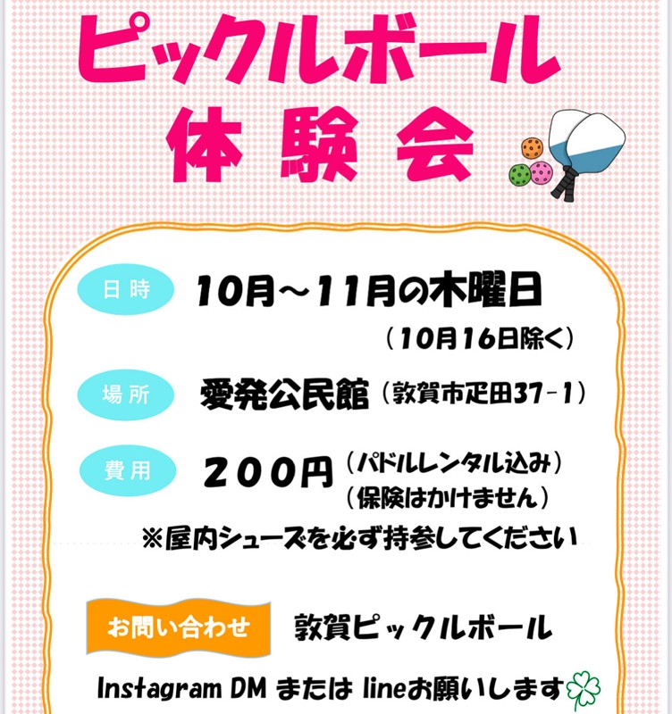 連絡事項や アピールポイント | みんな始めたてなので、気軽にお問い合わせください。 #ピックルボール #敦賀市 #福井県敦賀市 #生涯スポーツ #ニュースポーツ #テニス #卓球 #バドミントン #初心者さん歓迎 #やるなら今 |