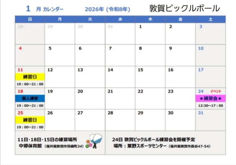 | 連絡事項や アピールポイント | 🎾 ピックルボール仲間募集!(福井県敦賀市) こんにちは! 私たちは、敦賀市で活動しているピックルボールサークル 「敦賀ピックルボール」 です✨ 毎週日曜日の夜に、みんなで楽しく体を動かしています! ピックルボールはテニスや卓球の要素がある、誰でも気軽に楽しめるニュースポーツ🎾 20代〜60代まで、幅広い年代のメンバーが和気あいあいとプレーしています。 ⸻ 📍 活動場所:中郷体育館(※詳細はお問い合わせください) 🕖 活動日:毎週日曜日 19:00〜21:15 💰 参加費:(初回体験無料OK) 👟 持ち物:動きやすい服装・室内シューズ(ラケット貸出あり) 🎯 目的:楽しく運動して健康づくり! ⸻ 初心者・未経験者も大歓迎! まずは見学・体験からどうぞ😊 一緒に楽しくピックルボールしませんか? みんな始めたてなので、気軽にお問い合わせください。 #ピックルボール #敦賀市 #福井県敦賀市 #生涯スポーツ #ニュースポーツ #テニス #卓球 #バドミントン #初心者さん歓迎 #やるなら今 |