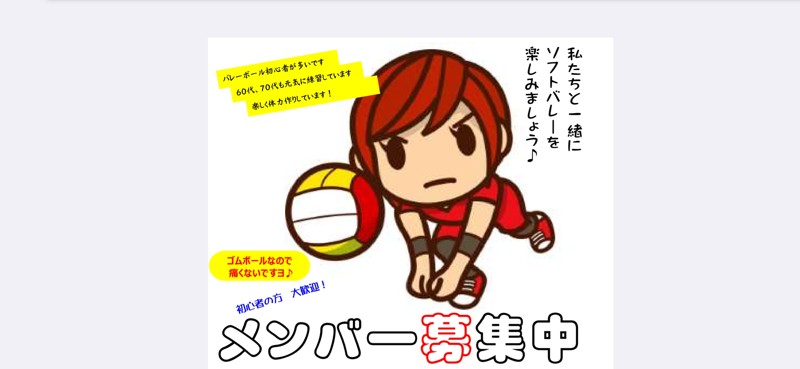 | 連絡事項や アピールポイント | 新しいメンバーさんを募集中です。私たちと一緒にソフトバレーをやりませんか?ゴムボールだから痛くありません。60代、70代も毎週元気に練習しています。未経験者が多いチームですので基礎練習(パス・レシーブ)もしっかりやっています。ソフトバレーならではの技術やルールも習得できますよ。体力作りやストレス発散目的でも大歓迎。経験者さんや他チーム所属のかたでもぜひ参加して下さい。【掛け持ち大歓迎】 まずは見学、体験参加してみてください。 会費:年間500円(スポーツ安全保険加入が必要です) ※体験参加は無料です。 ご注意願います【このような方は向きません】 ・メンバーさんの年齢や経験値を理解せずにレベルを調整されないバレー経験者の方。(相応レベルのチームをお探し下さい) ・ドタキャンを連発する方。 ・ソフトバレーの練習以外の目的の方。(内容によっては即退会して頂きます) ご質問などはお気軽にメッセージでご連絡ください。 担当 山下 |