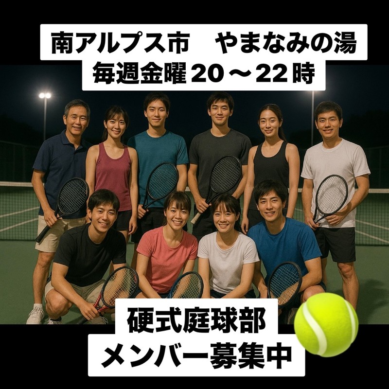 連絡事項や アピールポイント | 料金:300円 レベル:初中級 男性:30代5名、40〜60代5名 女性:30代4名(不定期参加) 不定期で月1回、月曜20〜22時にやまなみの湯1面でも開催。 毎週金曜にやってます。初回無料なので、まずは一度、一緒にテニスしましょう! |