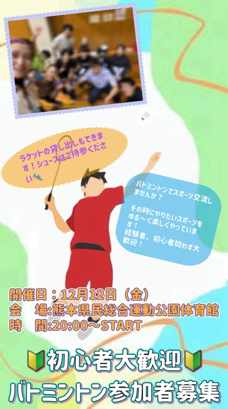 | 連絡事項や アピールポイント | 初めまして!管理人のまるです バドミントンでスポーツ交流しませんか?🏸 身体を動かしたい方、バドミントンが好きな方、友達づくりをしたい方大募集! その時にやりたいスポーツをゆる〜く楽しくやっています! 経験者、初心者問わず大歓迎😊✨️ 飲み物の準備もしております 冬も近づいてまいりましたが、しっかり水分補給をお願いします🚰☀️ 開催日 12月12日(金) 場 所 熊本県民総合運動公園体育館 時 間 20:00 ~START 体育館シューズの準備をお願いします ラケットの貸し出しも可能ですので気軽にご参加ください! ※当日のキャンセルなどは他の方や施設の迷惑になりますのでご遠慮ください 施設のルールをしっかり守って有意義な交流会にしていきたいと考えております✨️ 興味がある方はぜひご連絡ください お待ちしております! |
