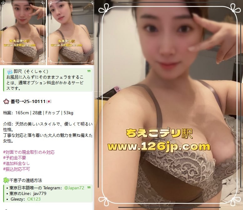 | 連絡事項や アピールポイント | こんにちは、初めまして。デリバリーのご紹介をしております。修正なし本人写真から自由に選択 可能。ご満足後のお支払いで安心、初めての方も誠実かつ安全にご利用いただけます。徹底した健康管理で衛生面も保証。ホテル・ラブホテル・ご自宅対応。完全予約制&匿名予約OK、プライバシー厳守で詐欺の心配も不要です。 検索→「ちえこデリ駅」 ご連絡はLINE:JAV779/TG:@Japan72 |