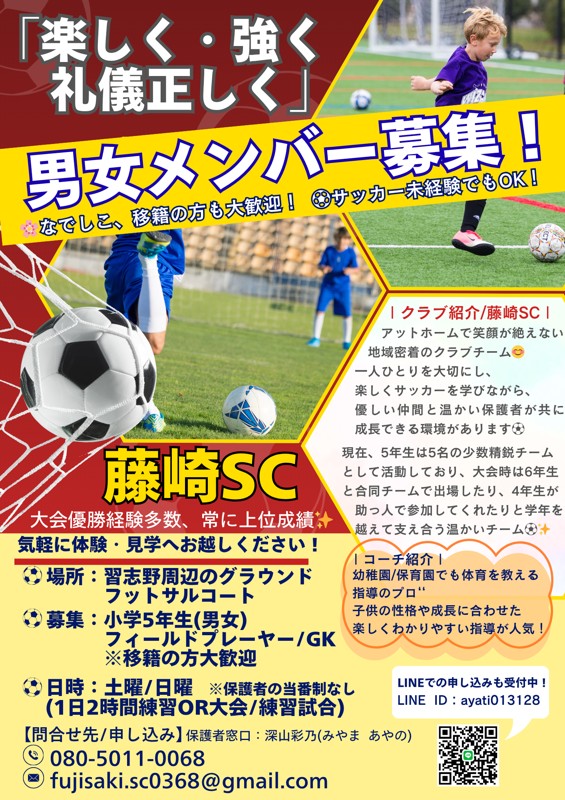 | 連絡事項や アピールポイント | 【楽しく・強く・礼儀正しく】をモットーに、 アットホームで楽しくサッカーを学びながら、 優しい仲間と温かい保護者と共に成長できる 地域密着なクラブチームです😊🏡 現在、5年生は5名の少数精鋭チームとして活動しており、 大会時は6年生と合同チームで出場したり、 4年生が助っ人で参加してくれたりと学年を越えて支え合い、 多くの大会での優勝経験や常に上位成績を残しています🏆✨ 募集は小学5年生男女メンバーですが、 フィールドプレーヤー/GKの方も募集しております🥅⚽ 経験者はもちろん、未経験者の方や移籍をお考え中の方も大歓迎✨ 少しでも気になってくれる方は ぜひ一度、見学や体験に来てください⚽ |