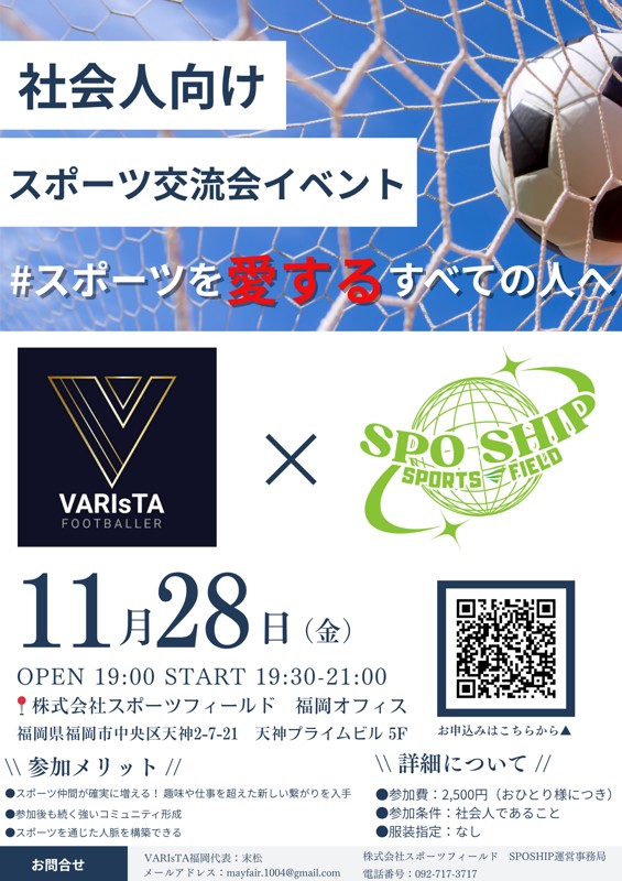 | 連絡事項や アピールポイント | ~~~~~~~~~~~~~~~~ ■詳細 ●対象 スポーツ(観る、する、支える)に関わる全ての社会人 ●日時 2025年11月28日(金)19:30~21:00 ●場所 スポーツフィールド九州オフィス 福岡市中央区中央区7 天神2-7-21 天神プライムビル 5F ●費用 2,500円 ~~~~~~~~~~~~~~~~ 【申し込み方法】 Googleフォームより✏️ https://docs.google.com/forms/d/1NcVSEbJZW06Z7q_2mHQ8yqc3L5GbAMnycsuHyAbO86Y/viewform?edit_requested=true 【開催目的】 ★スポーツに関わる方が、この会を通じて交流、そして繋がりをもってほしい。 ★開催後も繋がれるツールを通じて、スポーツコミュニティの活動を活性化してほしい。 ★2025年にリリースされたSPOSHIPのPR。 【開催背景】 色々なスポーツコミュニティが独自で懇親会を実施するのは見てきましたが、スポーツコミュニティ同士が集まり、交流会をするのをあまり目にしたことがなく、「開催したら新しい価値が生まれ、おもしろそうだな~」と考えた事がきっかけです。 是非、この交流会で様々な方と接点を持ち、新しいスポーツの交流の場が生まれる事を期待しております! 今回の交流会では、参加後も続く強いコミュニティ形成作りを検討中です。 交流会後も繋がれる機会を創出して、通常の交流会後とは違った流れにしたいと考えております。 そして、協賛いただくスポーツフィールド様の新サービス「SPOSHIP」もPR予定となります。 色々書いてはみましたが、「金曜の夜、スポーツ好きで集まって飲もうよ」の温度感で全然OKです🍺🙆♀️ 不明点あれば、お気軽にメッセージください。 どうぞよろしくお願いいたします! VARIsTA福岡 代表 末松 #スポーツを愛する全ての人へ |
