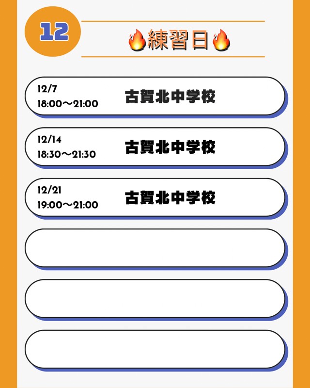 | 連絡事項や アピールポイント | ⭐️開催決定⭐️ 12/7 18:00〜21:00(古賀北中学校) 12/14 18:30〜21:30(古賀北中学校) 12/21 19:00〜21:00(古賀北中学校) 【新規立ち上げメンバー募集】 初心者メインで活動を開始したサークルです。 古賀市、コミセン和白で活動中のピックルボールサークルです。現在メンバーを募集しています。ピックルボールに興味がある方ぜひご連絡ください 【魅力ポイント】 初心者ばかり 1人で参加OK お友達とご一緒に参加OK 自由な集まりですので、たまに参加でもぜんぜんOKです 【活動場所】 古賀市小中学校体育館 コミセン和白 【活動時間】 毎月第1.2.3日曜日17:00〜22:00 (空き状況により時間前後します) 体育館の空き状況により開催できない 場合もありますので予めご了承ください 他活動日ありますが体育館の空き状況や 参加者希望によりランダムにて開催しております平日昼間、週末夜など 【応募条件】 ピックルボールに興味がある方、またはこれから始めたい方 和気あいあいと楽しめる方 運動不足解消 おしゃべりしたい方 【募集年齢】 社会人18歳以上~ 中学生〜高校生の方については保護者様等同伴でお願いします 【参加費】 300〜600円 ※参加人数、コートの面数、利用時間で変動します 練習時間 2〜4時間 運動しやすい服装 シューズ 飲み物 パドル(ラケット) 数本パドルレンタルあります(無料) 【お問い合わせ】 オープンチャット ✉️ miwadai.pickle@gmail.com Instagram miwadai.pickle #ピックルボール #ピックルボール福岡 #テニス #メンバー募集 #コミセン和白 #社会人サークル #福岡市東区和白 #社会人サークル新宮町 #ピックルボールメンバー #社会人サークル和白丘 #ソフトテニスチーム #初心者歓迎 |