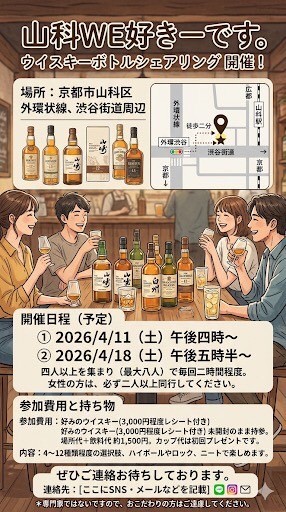 | 連絡事項や アピールポイント | 山科WE好きーです。 ウイスキー(コーヒー、お茶)のシェアを目的に、外国人の主催者で立ち上げたサークルです。 銀行員時代に酒を始めのせいで、各種のリカーに対してウイスキーにハマってしまいました。 本サークルはさまざまなウイスキー(コーヒー、お茶)を少しずつ試していただきたいと思いますので、ウイスキー(コーヒー、お茶)の美味しい飲み方や、選び方、楽しさを一緒に飲みながら共有します。 ・場所 京都市山科区外環線、渋谷街道 (外環渋谷、交差点歩行二分) ・開催日程 初回予定は2026/4/11午後四時 or 4/18午後五時半、ウイスキーボトルシェアリングです。土、日曜日、不定期で開催しています。 四人以上を集まり(最大八人)、毎回二時間程度です。 女性の方は必ず二人以上同行して欲しいです。(喫茶店のオーナーさんは女性) ・参加費用 好みのウイスキー(3000円程度レシート付き)未開封のままを持参してください。 場所代+飲料代やく1500円、カップ代初回はプレゼントです。 選択肢4〜12種程度、ハイボールやロック、ニートで飲用できるお楽しみ頂けます。 ・目標 短期:平日の昼間から飲めることは人生の至福です。(至らない、笑) 中期:スコットランドへ酒造を巡りです。 長期:日本のウイスキー作ります。 **スズメさん無料 ぜひご連絡お待ちしております。 専門家ではないですので、おこだわりの方はご遠慮していただきます。 |
