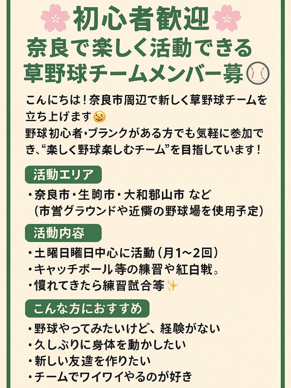 | 連絡事項や アピールポイント | こんにちは!奈良市周辺で新しく草野球チームを立ち上げます😊 野球初心者・ブランクがある方でも気軽に参加できる、 “楽しく野球を楽しむチーム”を目指しています! 現在メンバーは12名ほどで20代から50代まで幅広くいてます。 ほとんどのメンバーが学生時代未経験で大人になってから始めたメンバーばかりなので、初心者、未経験も大歓迎です。 現在立ち上げたばかりなのでグラウンドデビューは年明けからになります。 しばらくは近くの公園でキャッチボール等練習する予定です。 是非お気軽にお声掛けください! 【活動エリア】 奈良市・生駒市・大和郡山市 など (市営グラウンドや近隣の野球場を使用予定) 【活動内容】 ・月1〜2回、土、日曜日を中心に活動 ・キャッチボール、ノック、簡単な練習試合など ・経験よりも「楽しむ気持ち」を大切にしています✨ 直近の予定 11月23日大和郡山市 12月21日奈良市 1月11日奈良市 1月25日大和郡山市 【こんな方におすすめ】 ・野球やってみたいけど、経験がない ・久しぶりに身体を動かしたい ・新しい友達を作りたい ・チームでワイワイやるのが好き 【参加条件】 ・18歳以上の方(学生・社会人どちらもOK) ・常識のある方、チーム活動を楽しめる方 まずは体験参加からでも大丈夫です😊 興味を持ってくれた方はお気軽にメッセージください⚾ 一緒に楽しいチームを作りましょう! |
