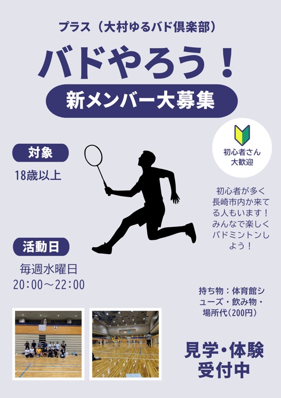 | サークル名 | プラス(大村ゆるバド倶楽部) |