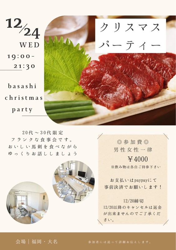 | 連絡事項や アピールポイント | クリスマス会🍖🍻 12/24日19時〜21時 場所はこちら502号 福岡県福岡市中央区大名1丁目2−50 会費男女一律4千円 参加条件は20代〜30代 ※イベント好きや友達作り欲しい方など 大歓迎ですので是非検討お願い致します🙇 参加されたい方はこのサイトに ご連絡お願い致します🤲 |