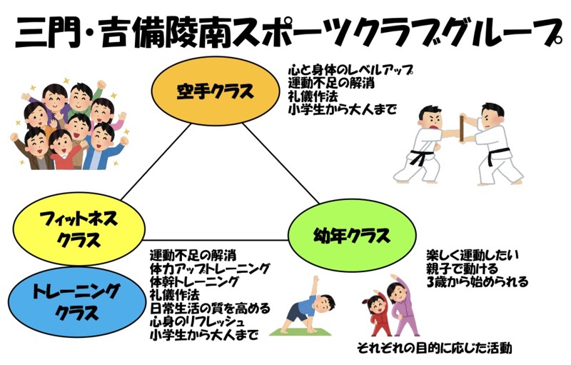| 連絡事項や アピールポイント | 岡山市にある三門駅周辺、吉備陵南にて活動しています。 ひとりひとりの「居場所づくり」をテーマに、練習場所がひとりひとりの「心と身体の成長できる場所」として、 幼年から小学生、中学生、大人まで幅広い年齢層が ①空手クラス、②フィットネスクラス、③トレーニングクラス、④幼年クラス のそれぞれの目的に応じたクラスで日々、身体を動かしています。 無理なく、ひとりひとりのレベルに合わせた練習メニューで、今まで自分自身が出来なかった事が出来るようになる場所として、様々な練習メニューに取り組んでいます。 空手指導員が各クラスを受け持ち、呼吸や姿勢も意識して、歩行トレーニング、体幹・筋肉トレーニング、バランストレーニングなどで身体能力の向上や維持に励んでいます。 また、各クラス共通として礼儀作法や、自主的に行動できることにも心掛けています。 初心者、経験者、年齢など問わず大歓迎です。 ①空手クラス 毎週月曜日19:00~21:00 吉備公民館実技室 毎週火曜日19:00~21:00 石井中学校1階格技場 毎週土曜日19:00~21:00 三門小学校体育館 ②フィットネスクラス 毎週水曜日19:00~20:00 石井中学校1階格技場 毎週金曜日19:00~20:00 岡西公民館実習室 毎週土曜日18:25~19:25 三門小学校体育館 ③トレーニングクラス(フィットネスクラス上級者向け) 毎週水曜日20:00~21:00 石井中学校1階格技場 毎週金曜日20:00~21:00 岡西公民館実習室 ④幼年クラス 毎週土曜日18:30~19:25 三門小学校体育館 ※各クラス活動日は、施設の開放日などにより異なります。 {お知らせ} 2026年2月から空手クラス 毎週月曜日に吉備公民館にて活動を開始します! 新クラスメンバーを大募集していますので、お気軽にお問い合わせください! 一緒に新しい道場を作っていきたいと思います!! 各クラス入会金、年会費、月謝などは異なります。 詳しくは各クラス代表者にお声掛けください。 見学、体験などお気軽にお問い合わせください! |