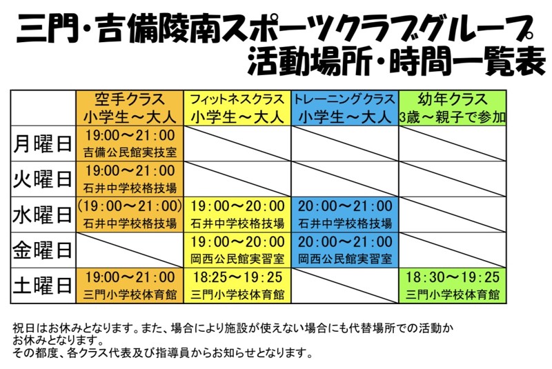 | 活動場所 | 岡山:三門小学校体育館・石井中学校格技場・岡西公民館・吉備公民館 |