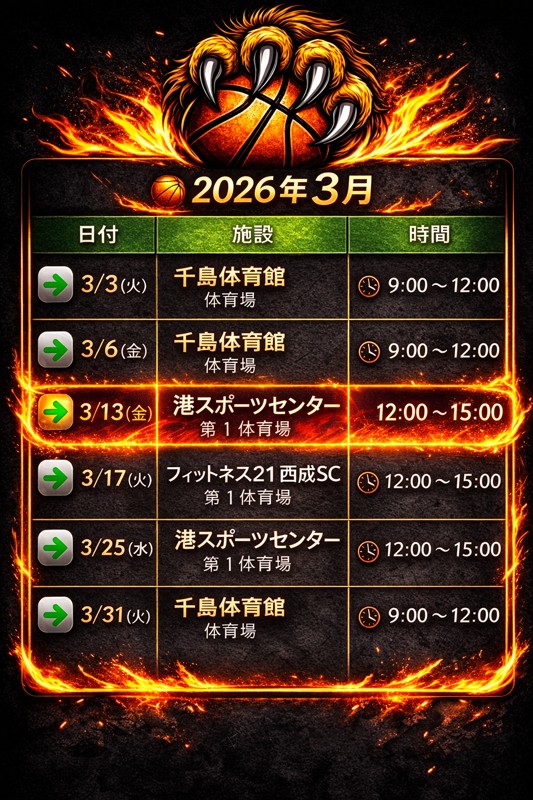 | 連絡事項や アピールポイント | 🏀 新規チーム始動!メンバー募集 🏀 大会出場を目標に、 本気で勝ちにいくチームを立ち上げます。 ✔ バスケが好き ✔ 向上心がある ✔ チームで強くなりたい そんなやる気ある方、大歓迎! みんなで一から、強いチームを作りましょう🔥 📍 場所:千島体育館 🕘 時間:9:00〜12:00 少しでも興味があれば、 お気軽にご連絡ください! |