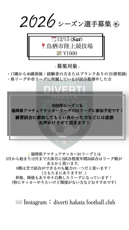 | サークル ホームページ | https://www.instagram.com/diverti.hakata.football.club?igsh=NzhocXprdTkxcjQ0 |