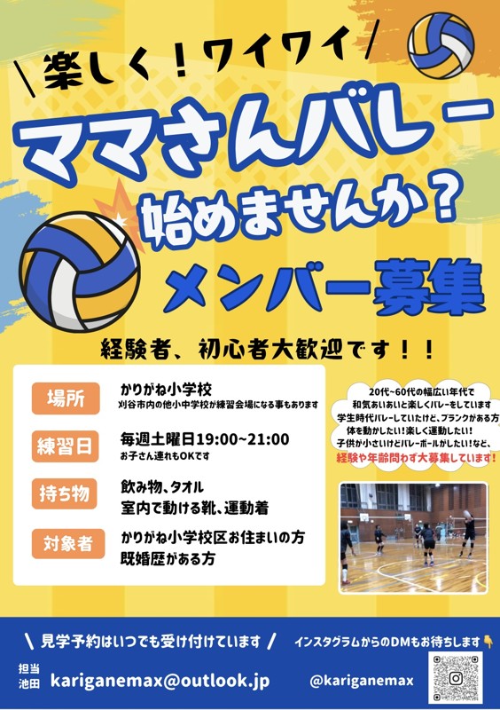 | 連絡事項や アピールポイント | こんにちは☺️ かりがね小学校区で活動している ママさんバレーチーム 【かりがねマックス】です🏐 かりがね小学校区にお住まいの方、 既婚者・既婚歴がある方、バレーボールを一緒に楽しみませんか? メンバーを大大大募集です🙌 現在、30代〜60代のメンバーで和気あいあいと生涯スポーツとして楽しくバレーボールをしています。 経験者で運動不足解消の為に、久しぶりにやってみようかな。 子供の手が少し離れたからバレー復帰しようかなという方🏐 ぜひ一度見学や体験でお越しください🙌 【練習日時】 毎週土曜日 18時45分頃〜21時 (ご自身のペースで来れる日だけでOKです🙆♀️) 【場所】 かりがね小学校 ※刈谷市内の他小中学校に変更になる場合もあります 【持ち物】 飲料水、タオル、室内で動ける靴 ⭐️年に数回、刈谷市内の大会に参加しています ⭐️お子さん連れも大丈夫です👌 前向きにバレー始めたい方、少しでも気になる方、まずは見学だけでも🤝 お気軽にご連絡ください🥰 あまり更新していないインスタグラム開設中 @kariganemax |