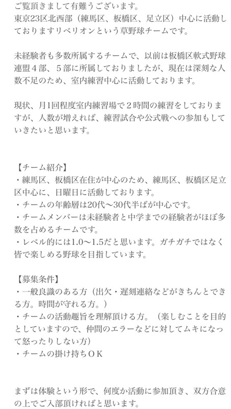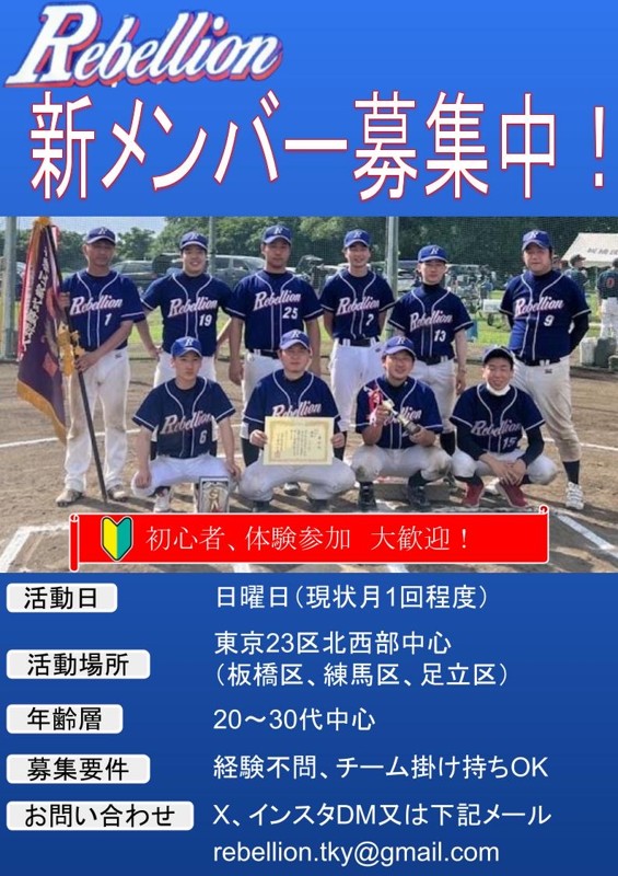 | 連絡事項や アピールポイント | ご覧頂きまして有難うございます。 東京23区北西部(練馬区、板橋区、足立区)中心に活動しておりますリベリオンという草野球チームです。 未経験者も多数所属するチームで、以前は板橋区軟式野球連盟4部、5部に所属しておりましたが、現在は深刻な人数不足のため、室内練習中心に活動しております。 現状、月1回程度室内練習場で2時間の練習をしておりますが、人数が増えれば、練習試合や公式戦への参加もしていきたいと思います。 【チーム紹介】 ・練馬区、板橋区在住が中心のため、練馬区、板橋区足立区中心に、日曜日に活動しております。 ・チームの年齢層は20代~30代半ばが中心です。 ・チームメンバーは未経験者と中学までの経験者がほぼ多数を占めるチームです。 ・レベル的には1.0~1.5だと思います。ガチガチではなく皆で楽しめる野球を目指しています。 【募集条件】 ・一般良識のある方(出欠・遅刻連絡などがきちんとできる方。時間が守れる方。) ・チームの活動趣旨を理解頂ける方。(楽しむことを目的としていますので、仲間のエラーなどに対してムキになって怒ったりしない方) ・チームの掛け持ちOK まずは体験という形で、何度か活動に参加頂き、双方合意の上でご入部頂ければと思います。 希望される方は、以下までご連絡頂ければと思います。ご検討宜しくお願いします! リベリオン 代表 rebellion.tky@gmail.com SNSもやっておりますので、参考にしていただけると幸いです。 インスタ:rebellion_tky X:@rebellion_tky |