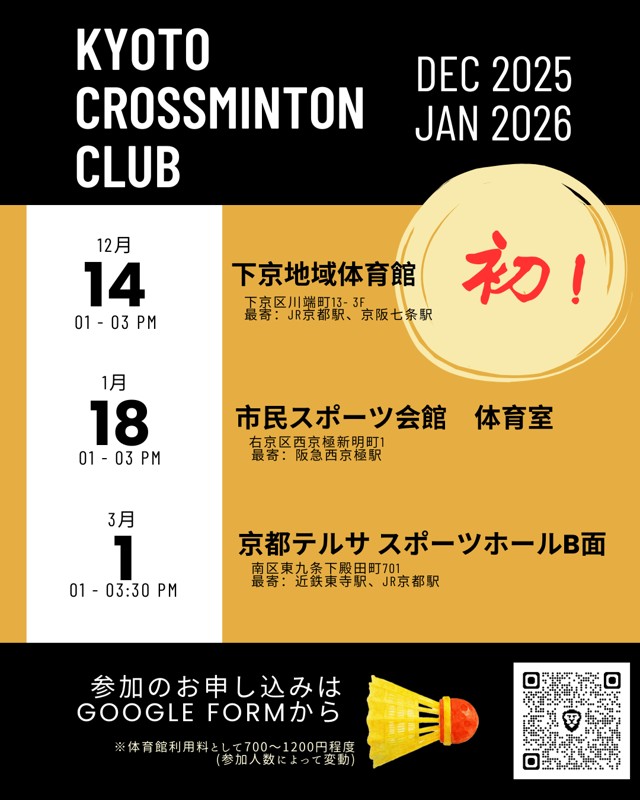 | 連絡事項や アピールポイント | 「クロスミントン」というスポーツをご存知ですか? バドミントンとテニスの中間のようなスポーツで、「スピーダー」というシャトルのようなものをラケットで打ち合います。ネットがないのでバンバン打てる! けどその代わり速い球が返ってくる・・・という、運動不足解消にもいいし、真剣勝負も楽しいスポーツです! 京都で初めて立ち上げたクラブなので、創設メンバー以外はみんな初対面。バドミントン経験者、テニス経験者、ラケット競技は初めての人ももちろん大歓迎! 30〜60代の幅広い年齢層で楽しみましょう。 気軽に参加・お問い合わせお待ちしております! ●1月18日13:00-15:00 市民スポーツ会館 体育室(西京極) ●3月1日13:00-15:30 京都テルサ スポーツホールB面 |