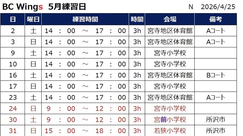 | 連絡事項や アピールポイント | 入間市で活動しているバドミントンサークルです。 基本 毎週土曜、日曜 入間市宮寺地区体育館および宮寺小学校で活動しています。活動内容としては、基礎打ち20分、残りの時間はゲームを中心に練習してます。気分転換、ストレス発散に一緒に楽しくバドミントンをしませんか? 指導者不在のため初心者の方及びゲーム経験のない方は申し訳ないのですがご遠慮下さい。 [参加費] ・ビジター 2時間 400円 3時間 500円 [募集条件] ・初中級者〜 ・ひと通りの基礎打ちができゲームが成立する方 ・経験年数 5年以上 [練習日] ・添付の写真で練習日を確認ください 代表者 中村 |