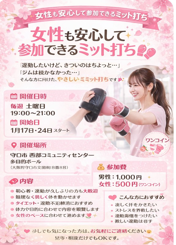 | 連絡事項や アピールポイント | 🌸 女性も安心して参加できる 🌸 やさしいミット打ちトレーニング 🥊 「運動したいけど、きついのはちょっと…」 「ジムは続かなかった…」 そんな方に向けた、 無理なく・楽しく・気持ちよく汗をかける ミット打ちトレーニングです✨ ⸻ 📅 開催日時 毎週 土曜日 19:00〜21:00 募集中 24日17時〜21日 🗓 開始日 1月17日・24日スタート ⸻ 📍 開催場所 守口市 西部コミュニティセンター 多目的ホール (大阪府守口市文園町8番8号) ⸻ 👊 内容 ・初心者/運動が久しぶりの方も大歓迎 ・無理なく楽しく体を動かせます ・ダイエット/運動不足解消に◎ ・体力や目的に合わせて内容を調整 ・女性のペースに合わせて進めます🌷 ⸻ 💰 参加費 男性:1,000円 女性:500円(ワンコイン) 24日は、1500円 ⸻ 🌼 こんな方におすすめ ・楽しく汗をかきたい ・ストレスを発散したい ・運動習慣をつけたい ・激しい運動は苦手 📩 見学・相談だけでもOK お気軽にご連絡ください☺️ |