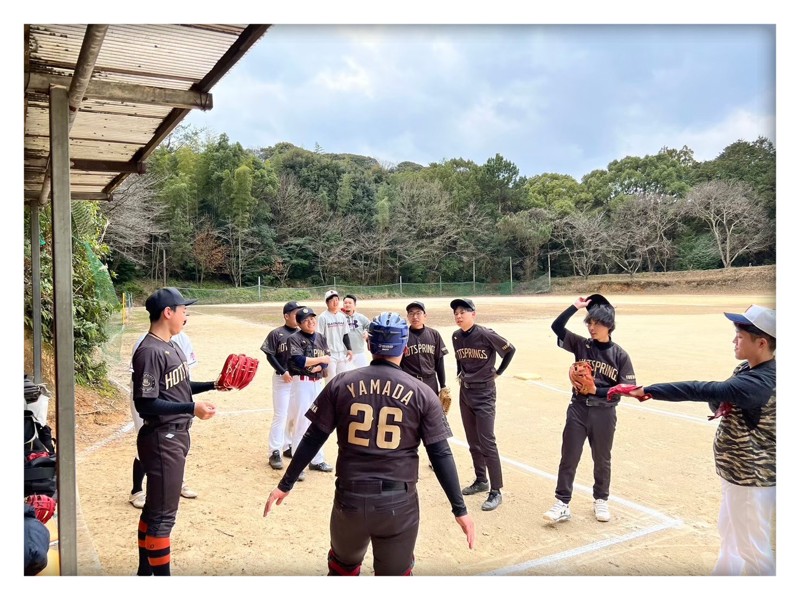 | 連絡事項や アピールポイント | ホットスプリングス(HOT SPRINGS)は、 地元を拠点に活動している草野球チームです。 チームコンセプトは 「勝って楽しむこと」。 勝利を目標に本気でプレーしますが、 ミスを責めることはせず、 声を掛け合いながら雰囲気良く野球をすることを大切にしています。 メンバーは 元高校野球経験者〜ブランクのある社会人が中心。 「もう一度、しっかり野球がしたい」 そんな方に合うチームです。 まずは助っ人・体験参加からでも大歓迎です。 |
