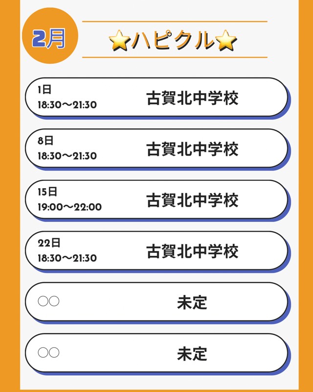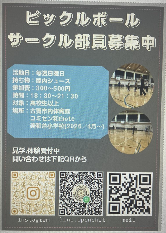 | 連絡事項や アピールポイント | はじめましてピックルボールチームのハピクルです 美和台小学校、コミセンわじろ、古賀市内小中学校で活動してます。 現在メンバーを募集しております😄 まだまだメンバーも少なく時には試合もできないほど😔 こんな少ないサークルですが元気と楽しさだけは何処にも負けません💪 【魅力ポイント】 初心者ばかり 1人で参加OK お友達とご一緒に参加OK 自由な集まりですので、たまに参加でもぜんぜんOKです 【活動場所】 美和台小学校 コミセン和白 古賀市内小中学校 【活動時間】 毎週日曜日18:00〜22:00 (練習時間3時間程度) 他活動日あります💦詳しくはインスタ 【募集年齢】 16歳以上~ 中学生〜高校生の方については保護者様等同伴でお願いします 【参加費】 300〜500円 参加人数、コート数、利用時間で変動します 【持参品】 運動しやすい服装 屋内シューズ 飲み物 パドル(ラケット) 数本パドルレンタルあります(無料) 【お問い合わせ】 メッセージ [検索]ピックルボールハピクル #ピックルボールハピクル #ハピクル #ピックルボール #ピックルボール福岡 #テニス #メンバー募集 #コミセン和白 #社会人サークル #福岡市東区和白 #社会人サークル新宮町 #ピックルボールメンバー #社会人サークル和白丘 |