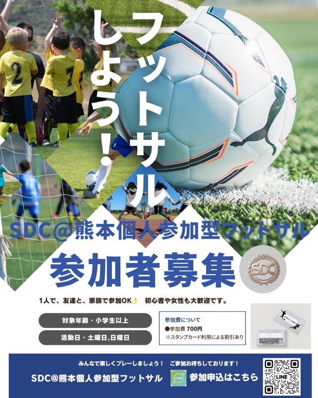 | 連絡事項や アピールポイント | \告知/ SDC@熊本個人参加型フットサルの活動を2026年から開始します! お一人でも、友達、家族と一緒でも大丈夫です。 (お子様のご参加は小学生以上とさせてください🙇) また、女性やフットサルをしたことないという方も歓迎しております。 活動場所や参加費はその都度変わりますので、ご注意ください。 ※参加費のベースが700円で、それを超えることはありません。活動場所によっては安くなります。 定員を20名としてますが、ご相談頂ければ参加を受け付ける場合もございますので、ぜひお問い合わせください。 皆様のご参加をお待ちしています! 詳しくはホームページをご覧ください。 気になる点がございましたら、お気軽にご相談ください😊 |