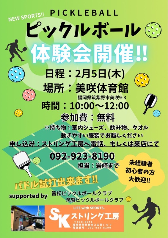 | 連絡事項や アピールポイント | 【筑紫野市近辺にお住まいの方、ぜひ体験してみませんか?】 こんにちは!福岡県内でピックルボールというスポーツの普及活動をしているしんじと申します。みなさん突然ですが、ピックルボール、やってみませんか? ピックルボールは、テニスや卓球、バドミントンの要素を取り入れたアメリカ発祥のスポーツで、今や全世界で話題沸騰中のスポーツです。1960年代に生まれたこのスポーツですが、コロナ禍を経て爆発的に人気が出てきております! 年齢・経験一切不問!運動不足解消にもピッタリです!「ラケットスポーツなんてやったことない…」という方もご安心ください。30分でラリーができるようになります! 当日はルール説明や簡単な打ち方のレクチャーから始めますので、まったくの初心者でもすぐにゲームに参加できます。 参加費無料でラケットも貸し出しますので、運動できる服装・室内用シューズ・飲み物だけお持ちください。 お友達同士の参加も、お一人での参加も大歓迎です! 【日時】 2026年2月5日(木)10:00〜12:00 参加希望の方はご連絡ください!どうぞよろしくお願いいたします! |