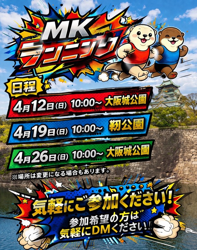 | 連絡事項や アピールポイント | はじめまして! 大阪でゆるく楽しく走る 【MKランニング】です🏃♂️✨ 「ランニング始めたいけど1人だと続かない」 「ガチすぎるのは苦手、でも体は動かしたい」 そんな人にぴったりの、ゆるラン中心のランニング会です! ペースは会話できるくらいで、距離も短め。 初心者・久しぶりの運動の方も大歓迎です🙆♂️ 20代中心で、初参加・おひとり参加の方も多いので安心してください! 走った後は、みんなで軽く話したりカフェしたりチルタイムを楽しんでます☕️ 「走る+ちょっとした交流」がコンセプトです! 基本毎週日曜日開催します! ※時間は日によって変わります ⸻ 【開催詳細】 📍場所:大阪城公園 🕓日時:4月12日(日)10:00〜 🏃♀️内容:ゆるラン(初心者OK) 👥対象:20代中心(初心者・初参加大歓迎) 今後の日程 4月19日(日)10:00〜靭公園 4月26日(日)10:00〜大阪城公園 ※今後の日程は決まり次第随時更新いたします 【注意事項】 *トラブル防止のため連絡先の交換はお控えください *ネットワークビジネス、集客目的での参加はご遠慮ください ⸻ 【参加方法】 下のテンプレを使ってメッセージください😊 質問だけでも大丈夫です! ⸻ 申込用テンプレ(コピペOK) 名前: 年齢: 一言:(初参加です/運動久しぶりです など) |