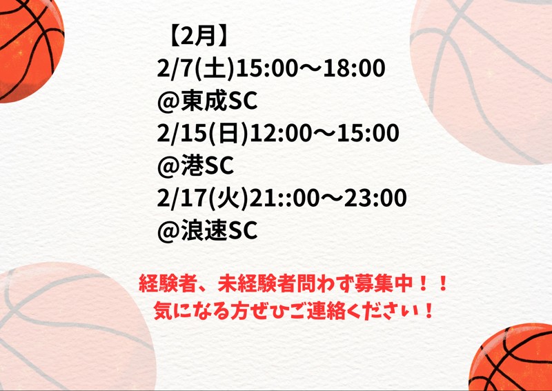| 連絡事項や アピールポイント | 大阪市内の体育館を中心に活動中! 初心者、経験者関係なく運動がしたい方を募集! Instagram、ジモティーでは、 毎月のバスケ🏀などのスケジュール🗓️(場所、時間、持ち物など)をお知らせ! ご参加可能な方、ご質問等がある方はお気軽にご連絡くださいませ! 🚨前日までにご連絡下さい ・お名前(フルネーム) ・年齢 ※19〜28歳程まで参加可能。 ・経験、未経験 【2月】 バスケ🏀 2/7(土)15:00~18:00 @東成SC 2/15(日)12:00~15:00 @港SC 2/17(火)21::00~23:00 @浪速SC バレー🏐 2/3(火)21:00~23:00 @浪速SC 2/10(火)21:00~23:00 @浪速SC 2/28(土)17:00~18:30 @PARK DAY 卓球🏓 靭テニスセンター卓球場B 2/7(土)9:00~11:00 参加費は500〜1000円でボールの貸出あります✨ 事前のご連絡をお願い致します🤲 【持ち物】 飲み物、タオル 体育館シューズ 動きやすい服装 あればバスケットボールやバレーボール、 ラケット🏀🏐🏓 ※ゼッケン無料貸出 ※ボールやラケット無料貸出 ※前日までにご連絡がない場合、参加が難しい場合があります。 [向いている人] ・リフレッシュしたい、ストレス発散したい人 ・運動不足を解消したい人 ・協調性がある人 など |