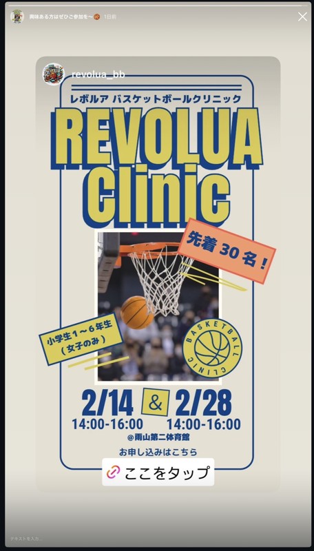 | 連絡事項や アピールポイント | Lake venus (滋賀銀行)OGと新チーム(R evoluaレボルア)を作り、新しい取り組みとして… 『自分たちが競技×地域の子ども達のバスケ育成』 2本柱で取り組む活動を始めました。 第一弾のバスケットクリニックとして下記に詳細がありますので、皆さんご自身のご家族や、周りの知り合いでバスケットに興味のあるお子さま(女子)がおられる方に是非おすすめしていただけたらと思います⛹️♀️ たくさんの応募お待ちしております🥰 🎉第一弾 Revolua(レボルア)単発クリニック 🔥🔥 先着30名 🔥🔥 Revoluaは、女子バスケットボール選手の育成・普及に特化した活動を行っています。 ■日 程: ①2月14日(土)14:00-16:00(13:30~受付開始) ②2月28日(土)14:00-16:00(13:30~受付開始) ■場 所:雨山第二体育館 〒520-3116 滋賀県湖南市雨山2丁目1−1 🅿️有 ■対 象:小学生1~6年生(女子のみ) ■参加費:参加費:500円(施設利用料および運営に必要な実費を参加者の皆さまにご負担いただく形となります) ※当日、現金にて受付致します。 ※お釣りがないようご準備ご協力お願いいたします。 ■持ち物:バスケットボール/バスケットシューズ/飲み物/着替え/参加費 ■締 切:2026年2月11日(水)〆切 ■問い合わせ先:📩revolua.bb@gmail.com ※当日、急な体調不良等で欠席される場合は、お手数ですが上記メールアドレスままでご連絡ください。 ※本クリニックでは主催者によるスポーツ保険等の加入は行なっておりません。怪我等に備えた保険加入は参加者ご自身でお願いいたします。 以下リンク🔗からの申し込みお待ちしております♪ https://tinyurl.com/2en2a2fp |