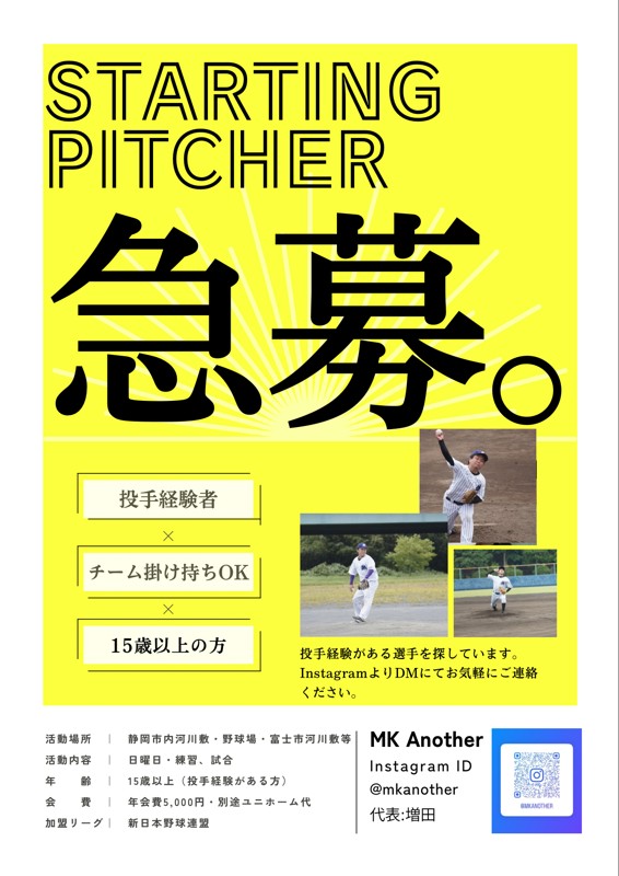 | 連絡事項や アピールポイント | ⚾️【投手・捕手 募集中】⚾️ 静岡で活動している草野球チーム **MK Another(エムケーアナザー)**です。 現在、 投手・捕手ができるメンバーを募集しています。 活動は 📅 日曜日 🗓 月に2〜3日程度 毎週ガチガチではなく、 仕事や家庭と両立しながら 草野球らしく楽しく続けることを大切にしています。 【チームの雰囲気】 ・勝ち負けも大事 ・でも草野球なので楽しく ・ミスしても責めない ・声を出してワイワイやるチームです⚾️ 【募集ポジション】 ・投手 ・捕手 【こんな方を探しています】 ・草野球経験者 ・ブランクありOK ・久しぶりに野球をやりたい方 ・チームの仲間と良好な関係を築ける方 ※チームワークを大切にしているため、 自己中心的なプレーや言動をする方はご遠慮ください。 体験参加・見学だけでもOK! 少しでも興味があれば お気軽にDMください。 Instagram:@mkanother 日曜日、楽しく野球やりましょう! |