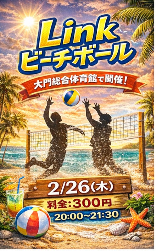 | 連絡事項や アピールポイント | こんにちは!! Linkといいます 社会人のスポーツを開催するさせていただいています 今回は大門総合体育館でビーチバレーを行いたいと思っています!! 20:00〜21:30開催で1人300円です ぜひ皆様お気軽にご参加ください😊😊 |