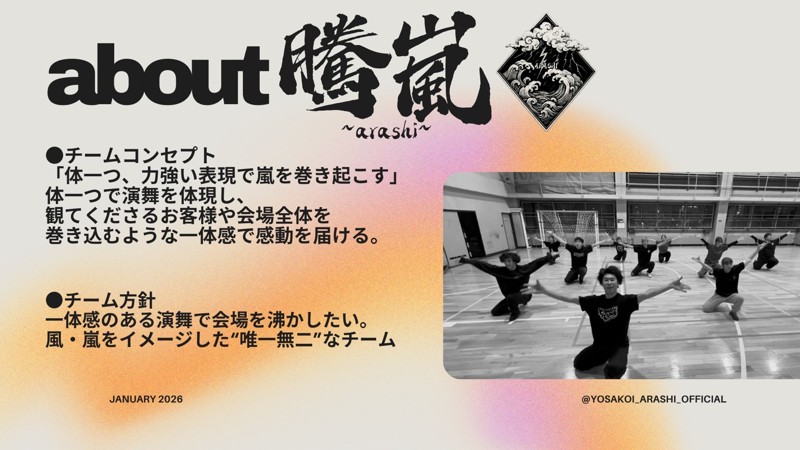 | 連絡事項や アピールポイント | はじめまして! YOSAKOIソーランチーム騰嵐~arashi~と申します! 私達は2026年の第35回YOSAKOIソーラン祭りに初参加するチームです🕺🔰 現在新規入会メンバー大募集しております! (踊り子🕺、MC🎤、旗士🏴) 2月も体験練習を札幌市内で開催します! ・2/11(水祝)13:00〜 アカシア若者活動センター ・2/14(土)13:00〜豊平若者活動センター ・2/21(土)13:00〜豊平若者活動センター ・2/28(土)13:00〜アカシア若者活動センター 上記日程で開催しております!! 一緒に楽しみながら踊りませんか?? 大人の青春を皆さんで楽しみましょう😌 チーム公式メールアドレスと各SNSよりお問い合わせください!お待ちしております! (yosakoi.team.arashi@gmail.com) |