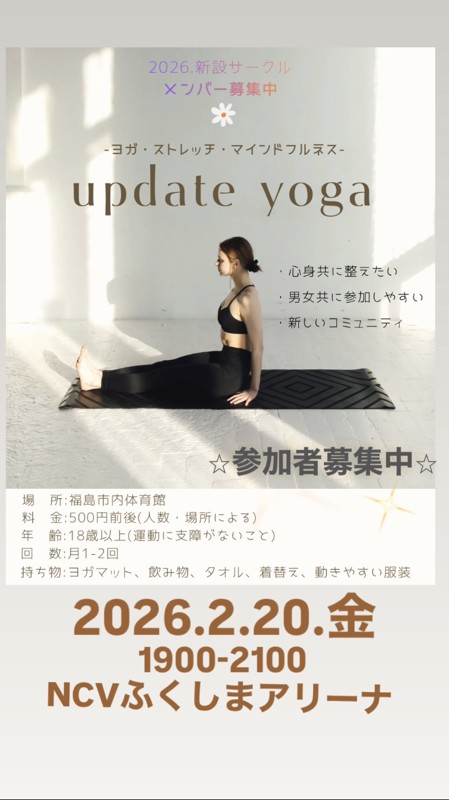 | 連絡事項や アピールポイント | メンバー募集しております! 【活動種目】 ヨガ、ストレッチ、マインドフルネスの融合 【活動開始】 2026年1月〜 【活動目標】 体と心を整える 男性も女性も参加しやすい 新しいコミュニティづくり 【活動場所】 福島市内体育館 / AOZなど 【募集メンバー】 リフレッシュしたい方 心身を整えたい方 ストレスを手放したい方 【時間/料金】 1時間〜2時間 平日:1900-2100 (+土日祝) 料金:300-500円 (人数場所による) 回数:月1-2回 【持ち物】 ヨガマット 飲み物 タオル 運動しやすい衣服(ストレッチ素材がおすすめ) 必要であれば着替え マスク着用可 --------------------------- 【応募時のお願い】 お名前、性別、年代、お住まいの地域をお知らせ下さい。 【立ち上げ理由】 スポーツやイベントが好きで、健康増進を目的としたNPOを設立するのが夢です。 資格はもっておりませんが、ヨガ、ストレッチ、マインドフルネスを融合した内容で、他にはない心地良さや、楽しさを提供できたらと思っています。 また気軽にヨガのできる場所がないという声を聴き、男性でも参加しやすい環境を作りたいと思いました。 スクールではなくサークル活動ですので、フランクにヨガを楽しみます。 【主な流れ】 音楽などを使用しながら、ゆったりとした時間を過ごします。 ヨガ自体は基礎的な動きがメインになります。 ストレッチも入れながら体の強張りや疲れを解放します。 始めと終わりには呼吸を意識し、心と体をリセット。 ラストはヨガマット上で横になり、安らぎのポーズでお休みします。 少し筋トレや音楽に合わせて動く動作も検討中です。 サークルなので少しずつ皆で出し合っていける様になれば嬉しいです。 【規約】 ・健全なスポーツを目的としていますので、マナーを守ってご参加をお願いします。 ・・スポーツ目的以外の参加(宗教、マルチ商法、オンラインセミナー、勧誘など)は出来ません。 ・運営上支障があると判断した場合は、参加をお断りする場合があります。ご了承ください。 ・当活動は、各々の怪我やトラブルについて責任を負いかねます。自己責任/自己管理の上、ご心配な方はスポーツ保険の加入をお勧めいたします。 ・18歳以上、運動に支障がないことを前提にお願い致します。 ・規約に同意のもと、ご参加お願いいたします。 ・料金は、主に施設利用代、備品代、キャンセル代などを含みます。 ・運営向上のため、規約を改定することがあります。 【オススメPoint】 ・リフレッシュできる ・男性でも気軽に参加できる ・初心者向け ・姿勢やインナーマッスルが鍛えられる ・1人では出来ない、でも大丈夫!皆となら出来る! ・前向きになれる ・新しいコミュニティ 興味があればメッセージをください! 一緒にマインドフルな時間を過ごしましょう^_^ |