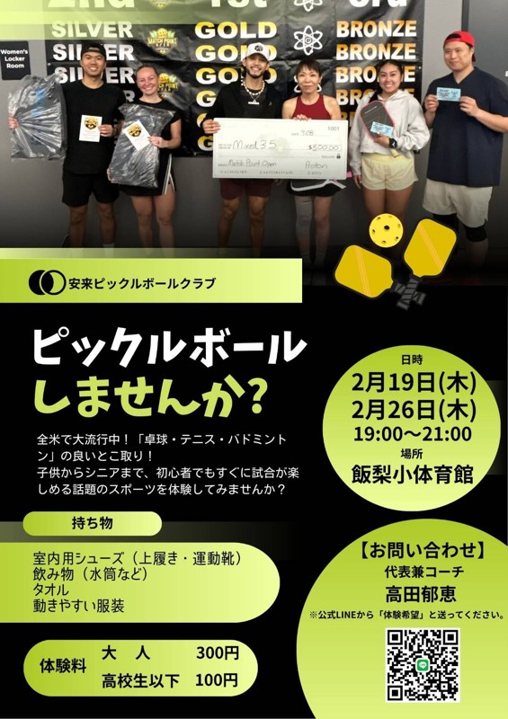 | 連絡事項や アピールポイント | 本番アメリカで、ピックルボールの大会で優勝してきた私ですがが、直々に一から指導し、楽しくゲームが出来るように活動しています! ぜひより多くの皆様とご縁があると良いなと思います! |