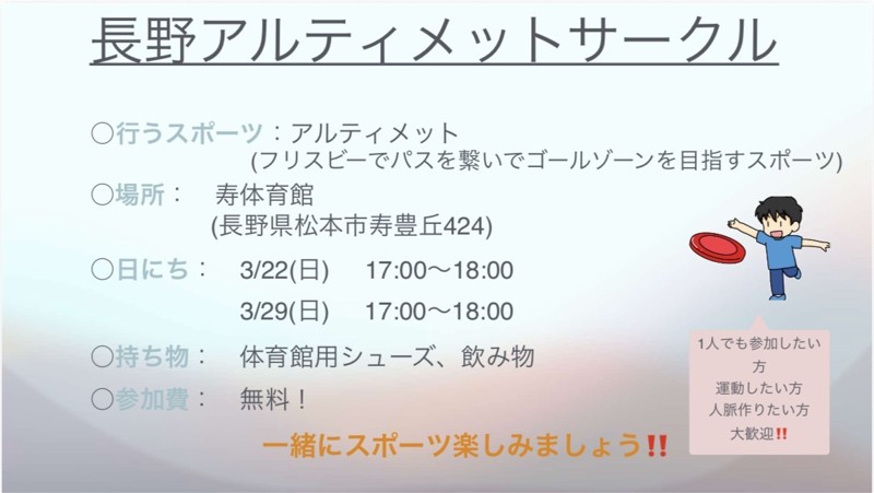 | 連絡事項や アピールポイント | 「社会人になってもスポーツがしたい!」 「色んな方に出会ってみたい!」 「運動不足を解消したい!」 そういう場を作りたいと思って始めました! アルティメットというマイナーなスポーツですが、初心者からでも出来るスポーツなので気軽に出来ます! 社会人メインの募集ですが、大学生も大歓迎です🙆 1人で参加したい方もぜひ! 行うスポーツ: アルティメット Q:アルティメットはどんなスポーツ? A:フリスビーを使ったチームスポーツで、パスを繋ぎながらゴールゾーンとなる指定された場所に持っていき点をとるスポーツです! 日時: 3/22(日) 17:00〜1800 3/29(日) 17:00〜18:00 (定期的に開催しています) 場所: 寿体育館 (長野県松本市寿豊丘424) 持ち物: 体育館で使えるシューズ、飲み物 料金:無料 最近作ったサークルですが、それでも良い方はぜひお待ちしています! 一緒に楽しくスポーツしましょう😊 |