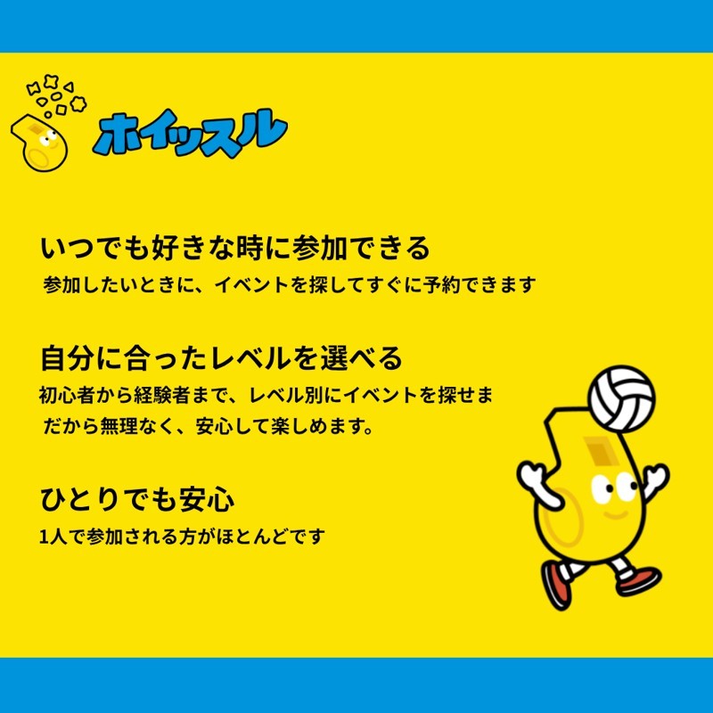 | 連絡事項や アピールポイント | 『いつでも気軽に、バレーを楽しもう🏐✨』 仕事終わりでも、週末でも。 日程、場所を選ぶだけすぐに予約・参加OK✨ レベル選択もあり、安心してバレーを楽しめます🏐 活動時間:平日・土日祝 参加申込・詳細はアプリまたはLINE登録 募集年齢:18歳以上 ▍ホイッスルとは  ̄ ̄ ̄ ̄ ̄ ̄ ̄ ̄ ̄ ̄ ̄ ̄ ̄ ̄ ̄ ̄ 初めまして! 都内近郊で開催している社会人フットサルサークルを掲載しているホイッスルです! バレー🏐以外にも、バスケ🏀、フットサル⚽️、バドミントン🏸ができます! 初心者・ブランクある方歓迎🔰 18歳以上 ホイッスルでバレーを楽しみませんか? 仲間とわいわいやりたい方向け!✨ 東京のサークルは 怪しい勧誘が多いですが... ホイッスルは若い人が 安心安全に楽しめます🙆♀️ ▍ホイッスルの特徴  ̄ ̄ ̄ ̄ ̄ ̄ ̄ ̄ ̄ ̄ ̄ ̄ ̄ ̄ ̄ ̄ 🟡いつでも好きな時に参加できる 参加したいときに、イベントを探してすぐに予約できます。 🟡自分に合ったレベルを選べる 初心者から経験者まで、レベル別にイベントを探せます。 だから無理なく、安心して楽しめます。 🟡ひとりでも安心 1人で参加される方がほとんどで、 初めてでも安心して参加できます。 ▍⭐️✨開催日程✨⭐️  ̄ ̄ ̄ ̄ ̄ ̄ ̄ ̄ ̄ ̄ ̄ ̄ ̄ ̄ ̄ ̄ ほぼ毎日開催中💨 詳しい日程はアプリまたは公式LINEをチェック❗️ ▍参加・詳細確認の流れ  ̄ ̄ ̄ ̄ ̄ ̄ ̄ ̄ ̄ ̄ ̄ ̄ ̄ ̄ ̄ ̄ 代表者や管理側との連絡は不要! アプリダウンロード or 公式LINEの登録で簡単に予約ができます⭕️ 🔸まずはURLクリックでアプリをダウンロード ↓ 🔸または公式LINEを追加(質問があれば公式LINEでお答えすることも可能です🙆♀️) https://liff.line.me/1656772038-aY5G7rMd/landing?follow=%40156iqxst&lp=5a6ftk&liff_id=1656772038-aY5G7rMd ↓ 🔸初回アンケート回答 ↓ 🔸LINE予約システムで、参加申込、詳細確認、質問 アプリはこちら • android: https://play.google.com/store/apps/details?id=com.hoistle.app&pcampaignid=web_share • ios: https://apps.apple.com/us/app/%E3%83%9B%E3%82%A4%E3%83%83%E3%82%B9%E3%83%AB/id6748577202 ▍活動場所  ̄ ̄ ̄ ̄ ̄ ̄ ̄ ̄ ̄ ̄ ̄ ̄ ̄ ̄ ̄ ̄ 世田谷区 / 荒川区 / 北区 / 川崎市 / 町田市  ̄ ̄ ̄ ̄ ̄ ̄ ̄ ̄ ̄ ̄ ̄ ̄ ̄ ̄ ̄ ̄ 詳細はアプリまたは公式LINEからご確認ください🙆♀️ よくある質問も掲載しています! ご参加お待ちしています🙇 |