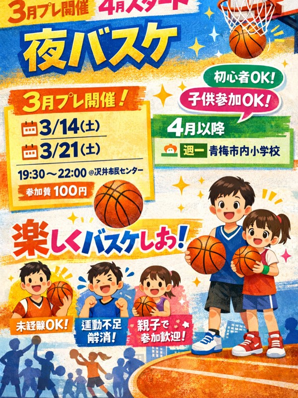 | 連絡事項や アピールポイント | 新しく社会人バスケットボールサークルを立ち上げます! 4月から本格スタート予定です🏀 その前に、プレ開催として以下の日程で活動します。 参加希望の方はメッセージください! ⸻ 🏀【3月プレ開催】 📍場所:沢井市民センター 体育館 🗓日程: ・3月14日(土) ・3月21日(土) 🕖時間:19:30〜21:30 💰参加費:100円 ⸻ 🏀【4月以降の活動】 📍場所:青梅市立第三小学校 🗓水曜日 🕖18:30〜21:30 💰参加費:100円 👥年齢層:20〜40歳くらい ⸻ レベルはガチすぎず、エンジョイ寄りです。 経験者はもちろん、初心者・ブランクがある方も大歓迎! ビブス、得点タイマー用意してあります。 👨👩👧👦 お子さんの参加もOKです! 親子参加も歓迎しています。 ※安全管理は保護者の方でお願いいたします。 ⸻ こんな方におすすめ ・楽しくバスケがしたい ・運動不足を解消したい ・社会人になってプレーする機会が減った ・子供と一緒に体を動かしたい 1人参加も大歓迎です! まずはプレ開催に気軽にご参加ください😊 ⸻ 【お問い合わせ時のお願い】 お問い合わせの際は、以下を記載してください。 ・お名前 ・年齢 ・お住まいの市町村 ・バスケ歴(未経験/学生時代のみ/現在もプレー中 など簡単でOK) ・お子様参加の場合は年齢 スムーズなやり取りのため、ご協力をお願いします。 ⸻ 【注意事項】 ・ナンパ目的での参加は禁止です ・宗教・マルチ・その他勧誘行為は禁止です ・最低限の挨拶や連絡など、コミュニケーションが取れない方はご遠慮ください みんなが安心して楽しくバスケできる場づくりにご協力をお願いします。 |