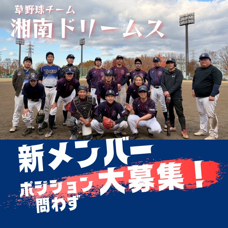 | 連絡事項や アピールポイント | 神奈川県内で活動している社会人草野球チーム「湘南ドリームス」です。 神奈川県座間市野球連盟に所属し、毎週土曜日を中心に活動しています。 当チームでは、技術レベルや経験よりも **無理なく継続して参加できること(出席率)**を大切にしています。 目安として、月2〜3回程度安定して参加できる方を歓迎しています。 活動場所は神奈川県内のグラウンドで、 固定の本拠地は持たず、グラウンド開放に応募して毎回事前に確定した場所を共有するスタイルです。 メンバーは20〜50代の社会人が中心で、 学生以来久しぶりに野球を再開したメンバーも多く在籍しています。 勝敗だけにこだわりすぎず、雰囲気良く、長く続けられるチームを目指しています。 ※ 単発参加や不定期参加をご希望の方は、今回は対象外とさせてください。 体験参加・見学も可能です。 ご興味のある方は、お気軽にご連絡ください。 ■募集要項 • 活動日:毎週土曜日 • 活動エリア:神奈川県内 • 年齢層:20〜50代 • 経験:不問(初心者・ブランクOK) • 募集ポジション:指定なし • 重視する点:継続参加・チームワーク |