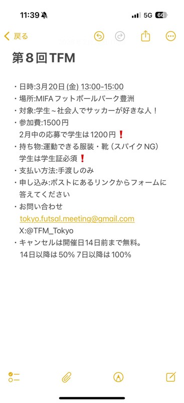 | 連絡事項や アピールポイント | https://x.com/tfm_tokyo/status/2021781405773238540?s=46 ↑こちらのポストをご確認いただき https://docs.google.com/forms/d/e/1FAIpQLSd_8whMeyvWtvFSM8KiFxDqEei71F2TB5U0HFX3hRV_Lr-clw/viewform ↑こちらのフォームを入力していただくことで参加登録となります。 東京都内で最大70人規模のフットサルイベントを開催しています。参加者の6割が経験者、4割が初心者‼️女性の参加者様もいらっしゃいます🙌人数によってはガチでプレーするチームとエンジョイでプレーするチームにわけています。気になることありましたらXのDMにて質問ください🙋 |