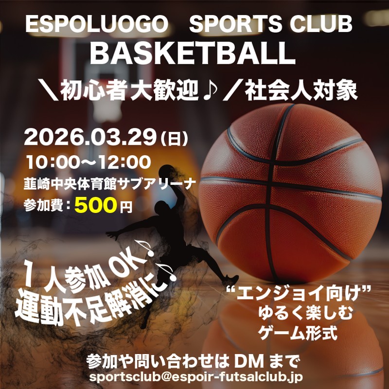 | 連絡事項や アピールポイント | 初心者大歓迎♪ 社会人対象のエンジョイバスケット開催! 「久しぶりにバスケしたい」 「運動不足を解消したい」 「楽しく体を動かしたい」 そんな方にぴったりのゆるく楽しむゲーム形式です。 経験・レベルは問いません。 みんなで笑いながら、気持ちよく汗をかきましょう! お一人での参加も大歓迎です! ⸻ 📌 連絡事項 ■ 日時:2026年3月29日(日)10:00~12:00 ■ 会場:韮崎中央体育館 サブアリーナ ■ 参加費:500円 ■ 対象:社会人(初心者OK) ■ 持ち物:室内シューズ、運動できる服装、飲み物 ※事前にDMまたはメールでご連絡ください。 ※ケガ防止のため、無理のない範囲でご参加ください。 ✳︎✳︎✳︎✳︎✳︎✳︎✳︎✳︎✳︎✳︎✳︎✳︎✳︎✳︎✳︎✳︎✳︎✳︎✳︎✳︎✳︎✳︎✳︎✳︎✳︎✳︎✳︎✳︎ エスポルオーゴ山梨スポーツクラブは、 「誰でも楽しく」をテーマに活動する総合型地域スポーツクラブです。 子どもから大人まで、年齢や経験に関係なく スポーツを通してつながり、成長できる場をつくっています。 勝ち負けだけを目的とせず、 挑戦する気持ちや仲間との時間を大切にするクラブです。 地域に根ざし、スポーツをもっと身近に。 そんな想いで活動しています。 ✳︎✳︎✳︎✳︎✳︎✳︎✳︎✳︎✳︎✳︎✳︎✳︎✳︎✳︎✳︎✳︎✳︎✳︎✳︎✳︎✳︎✳︎✳︎✳︎✳︎✳︎✳︎✳︎ |