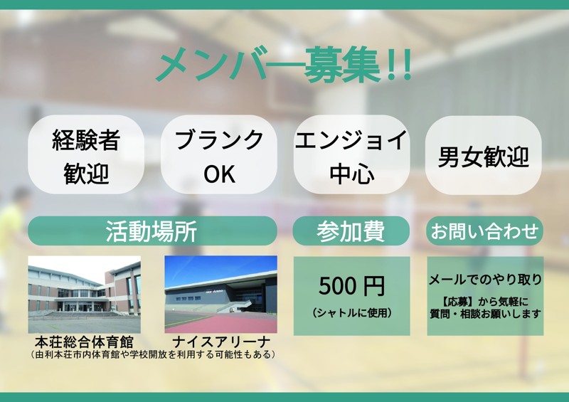 | 連絡事項や アピールポイント | 由利本荘市でバドミントンを楽しむサークルを新しく立ち上げたいと考えています。 「久しぶりにバドミントンをやりたい」 「運動不足を解消したい」 そんな方を歓迎します。 学生時代に部活でやっていた方など、ラリーがある程度続く方を想定しています。ブランクがあっても大丈夫です。 活動は市内体育館で土曜または日曜の夜(19:00〜21:00)に、月2回程度を予定しています。参加人数に応じて開催します。(人数が集まり次第開催です‼) 基本はエンジョイですが、希望があれば大会参加も目指していきたいと考えています。 男女問わず募集していますので、興味のある方はお気軽にご連絡ください‼ 【よくある質問】 Q. 見学はできますか? A. 可能です。雰囲気を見てから参加を決めていただいて大丈夫です。 Q. 初心者でも参加できますか? A. ラリーがある程度続く方を想定しています。 学生時代の経験やブランクがある方は歓迎です。 Q. 参加費はありますか? A. 体育館使用料やシャトル代として、1回参加ごとに500円ほどを予定しています。 Q. サークルのレベルは? A. 学生時代の部活経験者やブランクのある社会人など、初級〜中級程度を想定しています。 Q. 持ち物は何が必要ですか? A. ラケット、室内シューズ、運動できる服装をご用意ください。 |