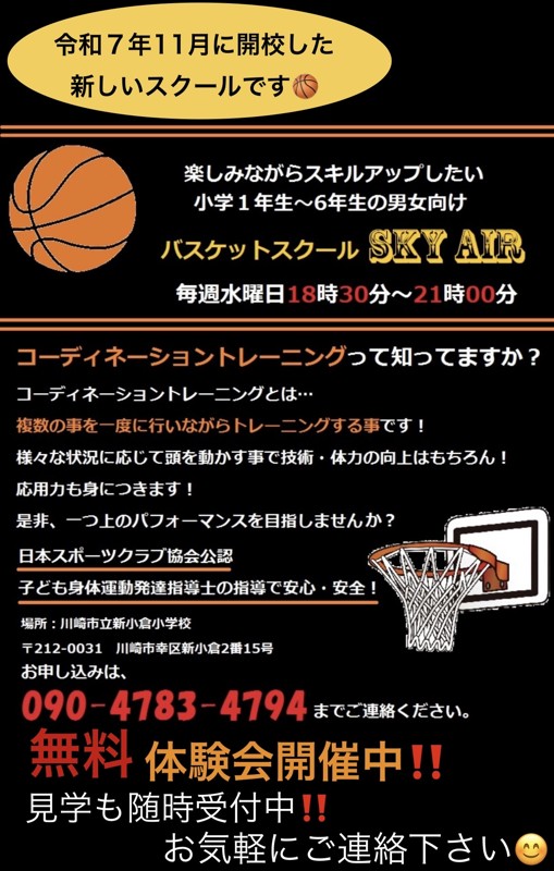 | 連絡事項や アピールポイント | 令和7年11月に開校した新しいスクールです☆ 楽しみながらスキルアップしたい! 小学1年生~6年生の男女向け 毎週水曜日18時00分~21時00分 コーディネーショントレーニングって知ってますか? コーディネーショントレーニングとは… ・複数の事を一度に行いながらトレーニングする事です! 様々な状況に応じて頭を動かす事で技術・体力の向上はもちろん!応用力も身につきます! 是非、一つ上のパフォーマンスを目指しませんか? 日本スポーツクラブ協会公認 子ども身体運動発達指導士の指導で安心・安全! 場所:川崎市立新小倉小学校 〒212-0031 川崎市幸区新小倉2番15号 お申し込みは 090-4783-4794までご連絡ください。 無料体験会開催中!!見学も随時受付中!! お気軽にご連絡下さい☆ |